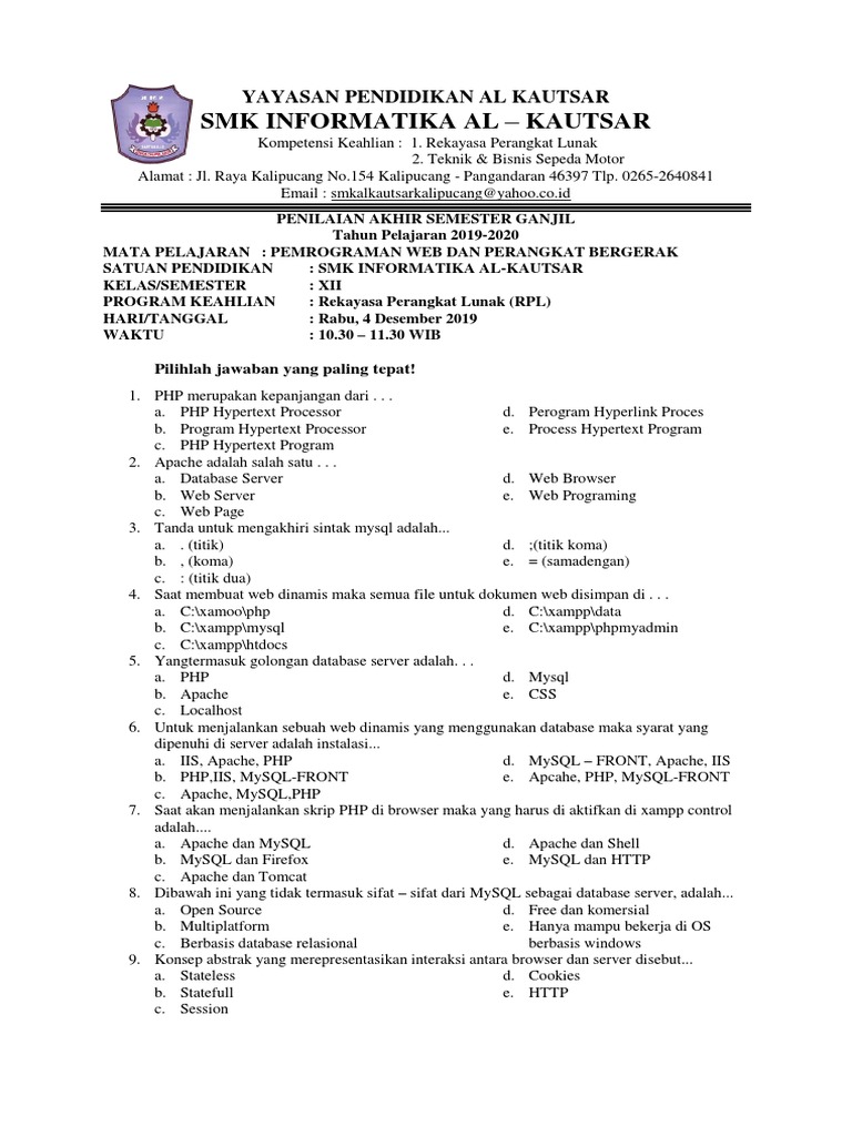Menjelaskan materi adapun materi pokok pemrograman web dan perangkat bergerak yang akan diajarkan adalah sebagai berikut: Web pada umumnya digunakan untuk melakukan respon dan request yang dilakukan antara client dan server. Kumpulan soal tkj dan rpl kelas x, xi dan xii lengkap baca juga : Sebuah bahasa markup yang digunakan untuk membuat sebuah halaman web adalah. Smk doa bangsa palabuhanratu rekayasa perangkat lunak pemrograman web dan perangkat bergerak xi / 1 konsep tampilan multimedia dalam html html 1 kali pertemuan ( 8 x 45 menit ). Kumpulan soal pemrograman web dinamis kelas xi smkn manonjaya. Apa yang di maksud sgml ? Berikut adalah contoh soal pemrograman web dan perangkat bergerak. Pemrograman web dan perangkat bergerak. Soal pilihan ganda dan essay kls 12 pbo (pemograman berorientasi objek) a. Pemrograman web dan perangkat bergerak durasi (waktu) : Untuk membangun websites, anda harus mengetahui tentang html — teknologi dasar yang digunakan untuk menentukan struktur halaman web. Pemograman web dan perangkat bergerak smk mak kelas xii shopee.